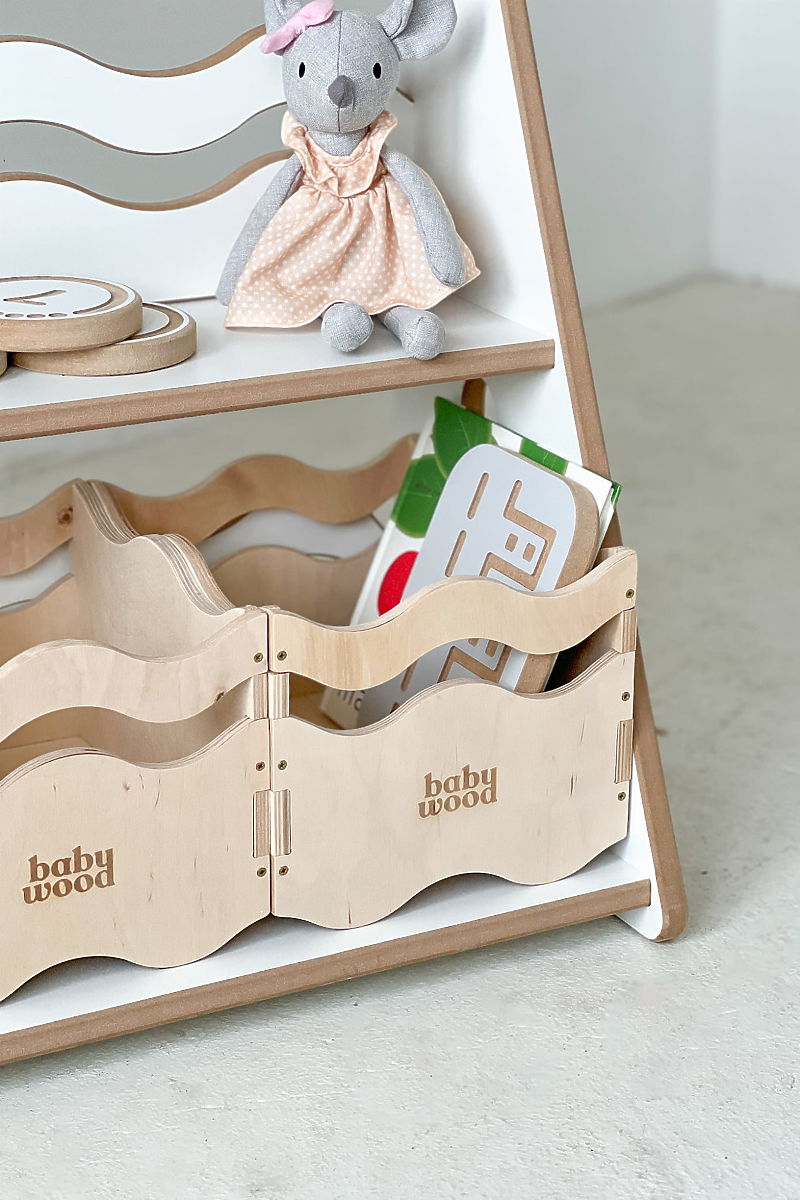 Biblioteca și raftul WAVE M combină două funcții într-un singur produs – partea superioară servește ca bibliotecă, iar partea inferioară ca spațiu de depozitare pentru jucării. Acest design practic este ideal pentru părinții care doresc să aibă totul la un loc, fără a avea nevoie de două piese separate de mobilier. Barele frontale ondulate îmbină funcționalitatea cu un design modern – sunt sigure pentru copii și, în același timp, elegante. Datorită înălțimii ergonomice, micul utilizator poate ajunge cu ușurință la cărți și jucării, ceea ce încurajează independența în spiritul Montessori.