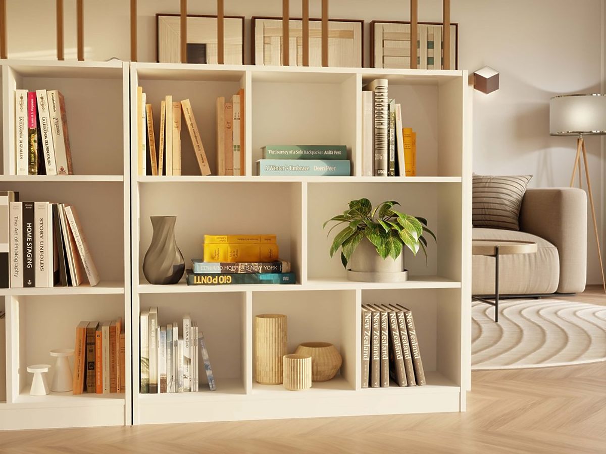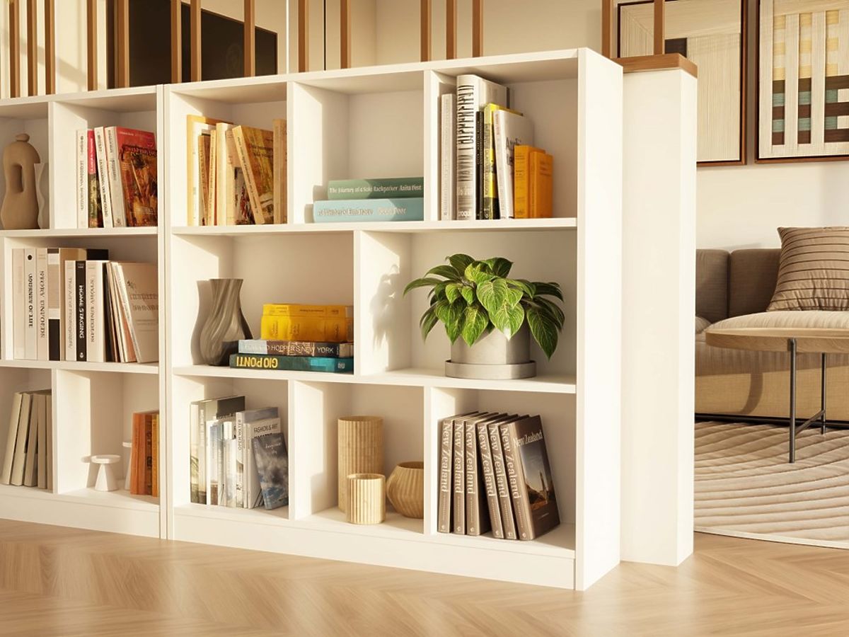 - 8 rafturi/compartimente funcționale – ideale pentru cărți, decorațiuni sau cutii de depozitare.