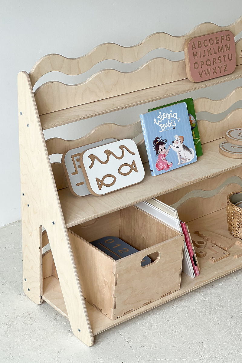 Raftul WAVE L în culoare naturală este o bibliotecă practică și decorativă, care ajută la menținerea ordinii în camera copilului și, în același timp, încurajează independența copilului. Datorită rafturilor clare, copilul are acces ușor la cărți, jucării și obiecte mici. Rafturile cu o adâncime de 4 cm sunt ideale pentru cărți mai mici și decorațiuni, în timp ce barele frontale ondulate adaugă un detaliu de design delicat raftului. Materialele stabile și execuția sigură asigură o durată lungă de viață și utilizare sigură chiar și pentru copiii mici.