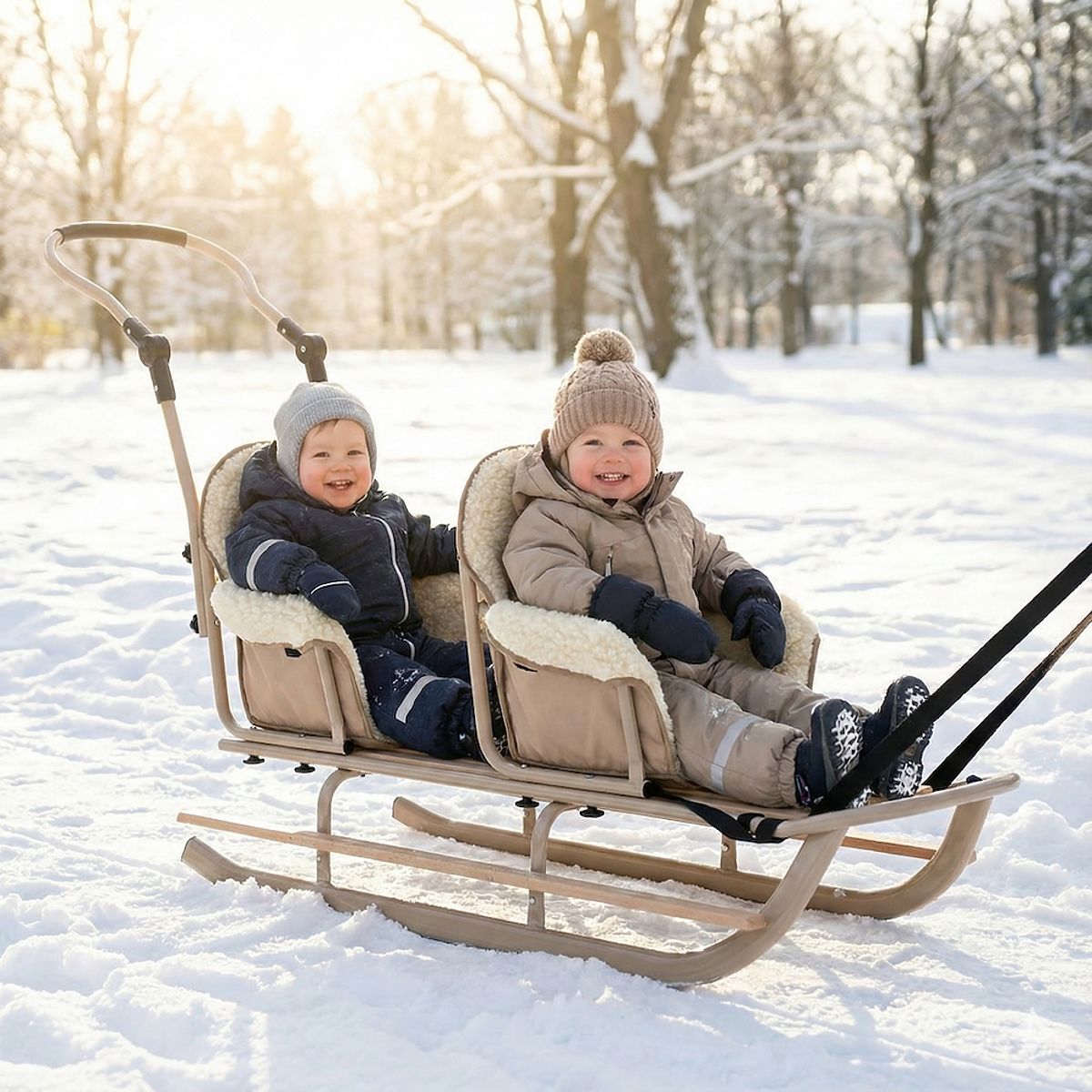 Construcția universală bej a săniilor se potrivește perfect atât pentru fetițe, cât și pentru băieței.