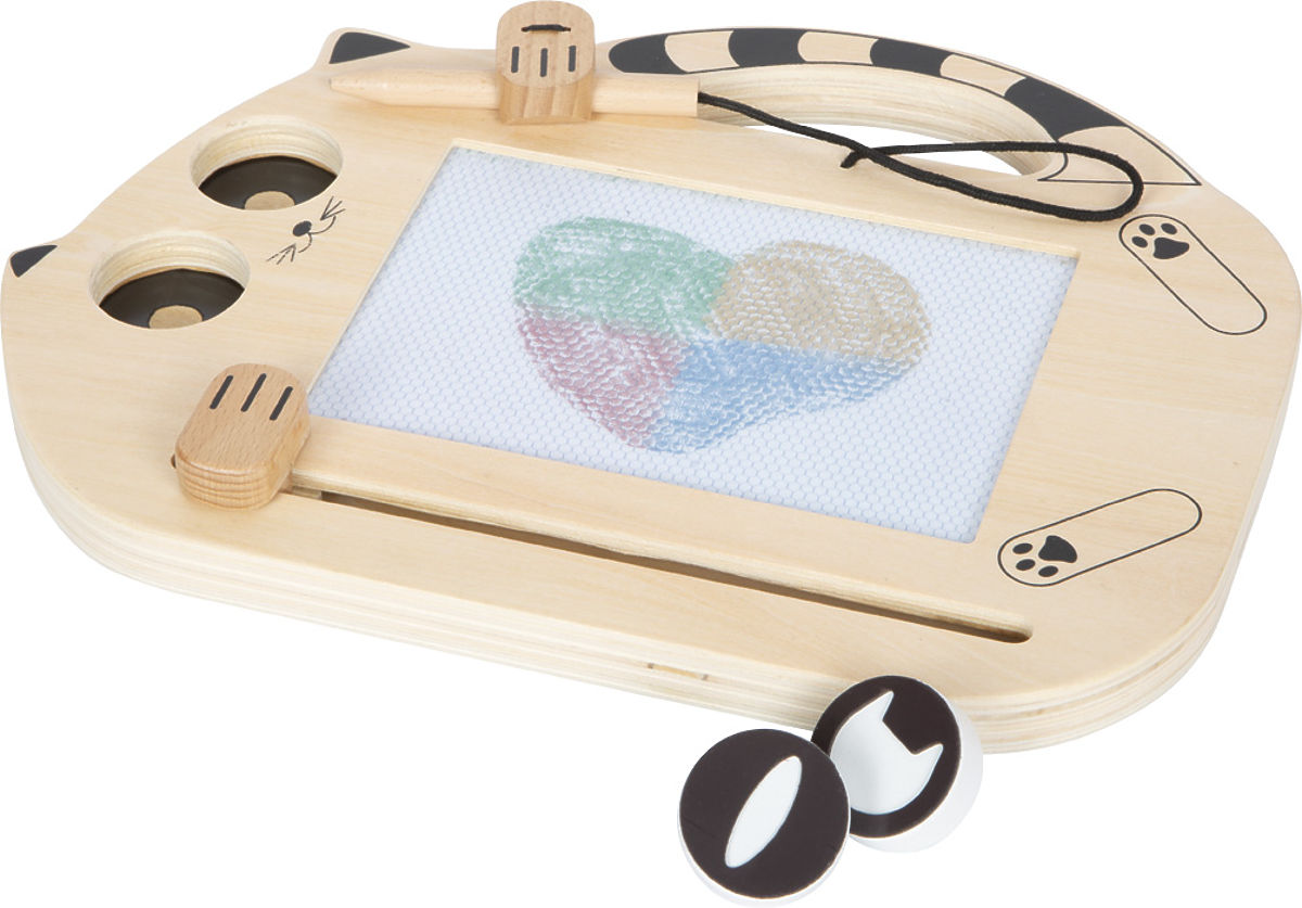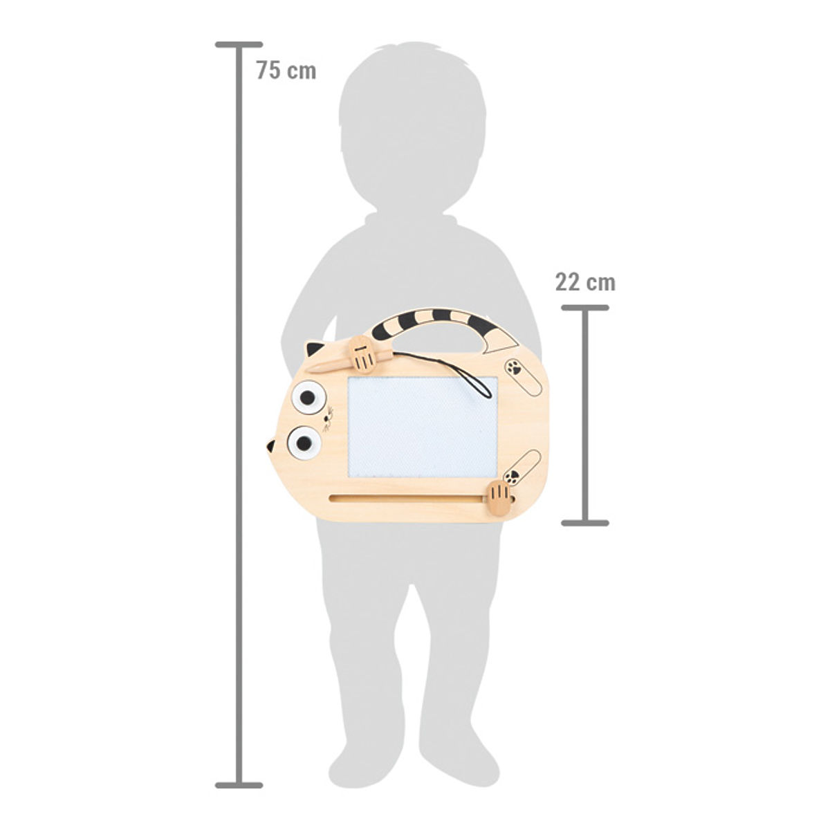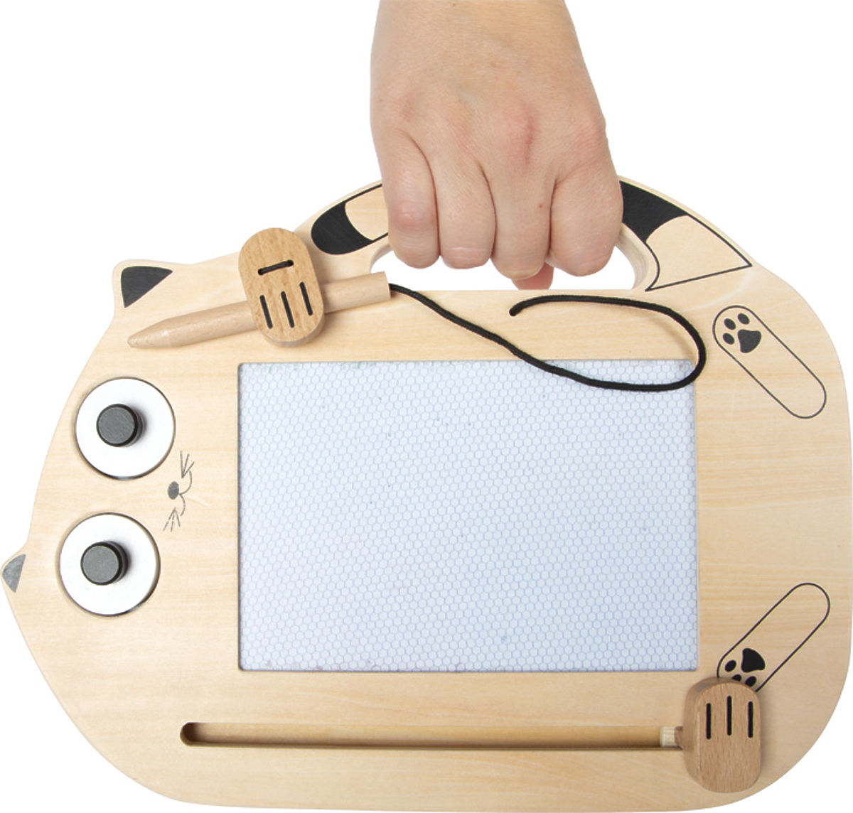 Distracție creativă pentru micii artiști! Tablă de desen magnetică în formă de pisică, ideală pentru copiii care iubesc să deseneze. Cu ajutorul stiloului, pot fi create din nou și din nou noi imagini. Două ștampile cu motive de ochi de pisică și cap de pisică oferă posibilități suplimentare de a crea opere de artă unice. Când stiloul nu este utilizat, poate fi fixat în siguranță sub lăbuța pisicii, iar datorită faptului că este atașat de tablă cu un șnur, nu se va pierde. Când capodopera este finalizată sau doriți să creați ceva nou, imaginea poate fi ștearsă simplu cu ajutorul unui cursor - astfel totul este pregătit în scurt timp pentru o nouă creație! Datorită mânerului integrat pentru transport și dimensiunilor compacte, tabla poate fi luată oriunde. Bucurați-vă de distracția creativă care nu se termină nici în călătorii! Caracteristici principale: cu stilou din lemn și 2 ștampile, stilou pe șnur atașat de tablă cu lăbuța, desen infinit cu radiera magică, cu mâner pentru transport, fabricat din lemn de înaltă calitate, potrivit și pentru călătorii.