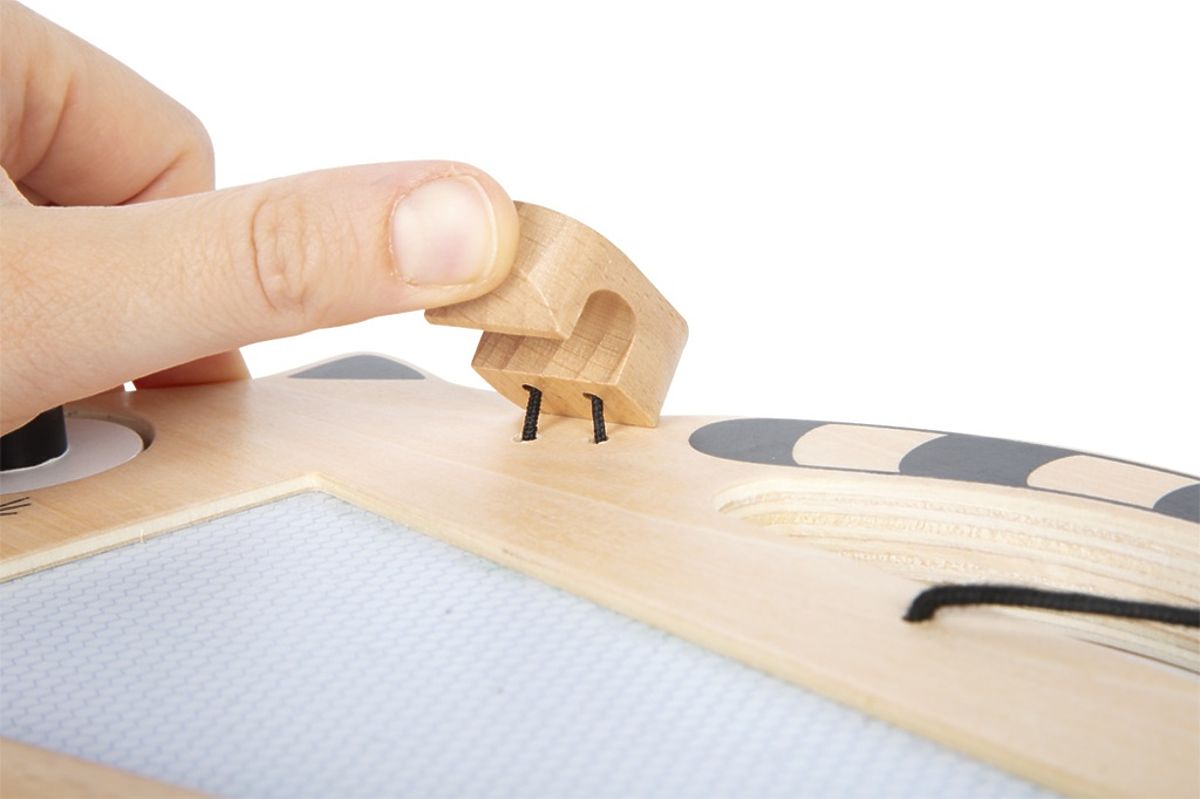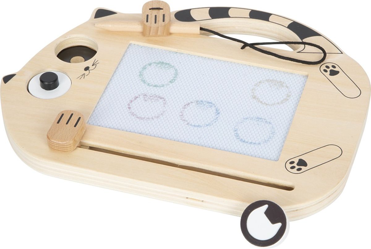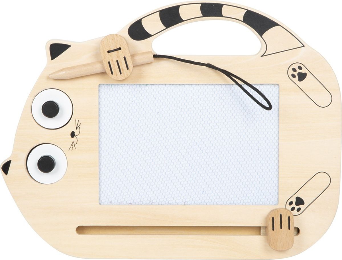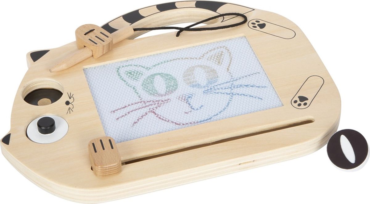 Distracție creativă pentru micii artiști! Tablă de desen magnetică în formă de pisică, ideală pentru copiii care iubesc să deseneze. Cu ajutorul stiloului, pot fi create din nou și din nou noi imagini. Două ștampile cu motive de ochi de pisică și cap de pisică oferă posibilități suplimentare de a crea opere de artă unice. Când stiloul nu este utilizat, poate fi fixat în siguranță sub lăbuța pisicii, iar datorită faptului că este atașat de tablă cu un șnur, nu se va pierde. Când capodopera este finalizată sau doriți să creați ceva nou, imaginea poate fi ștearsă simplu cu ajutorul unui cursor - astfel totul este pregătit în scurt timp pentru o nouă creație! Datorită mânerului integrat pentru transport și dimensiunilor compacte, tabla poate fi luată oriunde. Bucurați-vă de distracția creativă care nu se termină nici în călătorii! Caracteristici principale: cu stilou din lemn și 2 ștampile, stilou pe șnur atașat de tablă cu lăbuța, desen infinit cu radiera magică, cu mâner pentru transport, fabricat din lemn de înaltă calitate, potrivit și pentru călătorii.