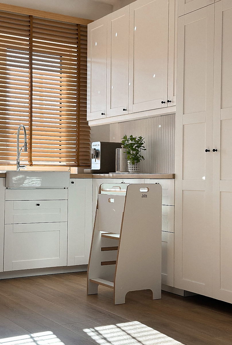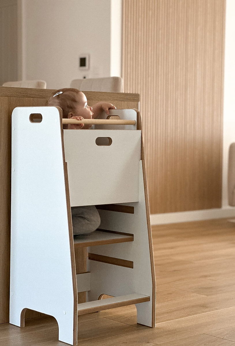 Kitchen Helper Comfort este un ajutor de bucătărie inteligent, datorită căruia copiii se pot implica în siguranță în activitățile zilnice din bucătărie. Le permite să stea stabil la înălțimea potrivită și să participe activ la pregătirea mâncărurilor, în timp ce părinții au certitudinea că totul este sigur și sub control. Cu designul său curat, se potrivește atât în bucătăriile moderne, cât și în cele clasice. Acest ajutor oferă copilului un spațiu nu doar pentru a ajuta la gătit, ci și pentru a descoperi, învăța și petrece timp împreună. Susține independența și dezvoltarea naturală a abilităților încă de la o vârstă fragedă.