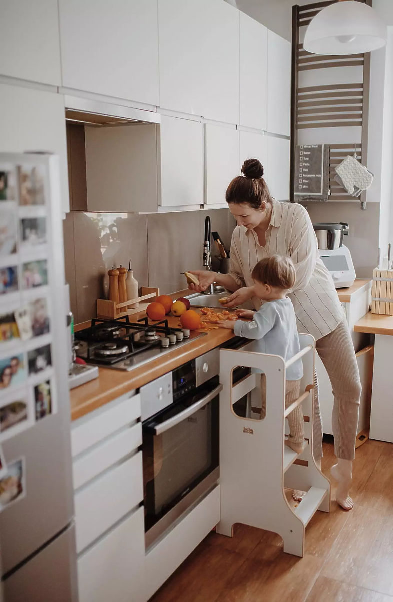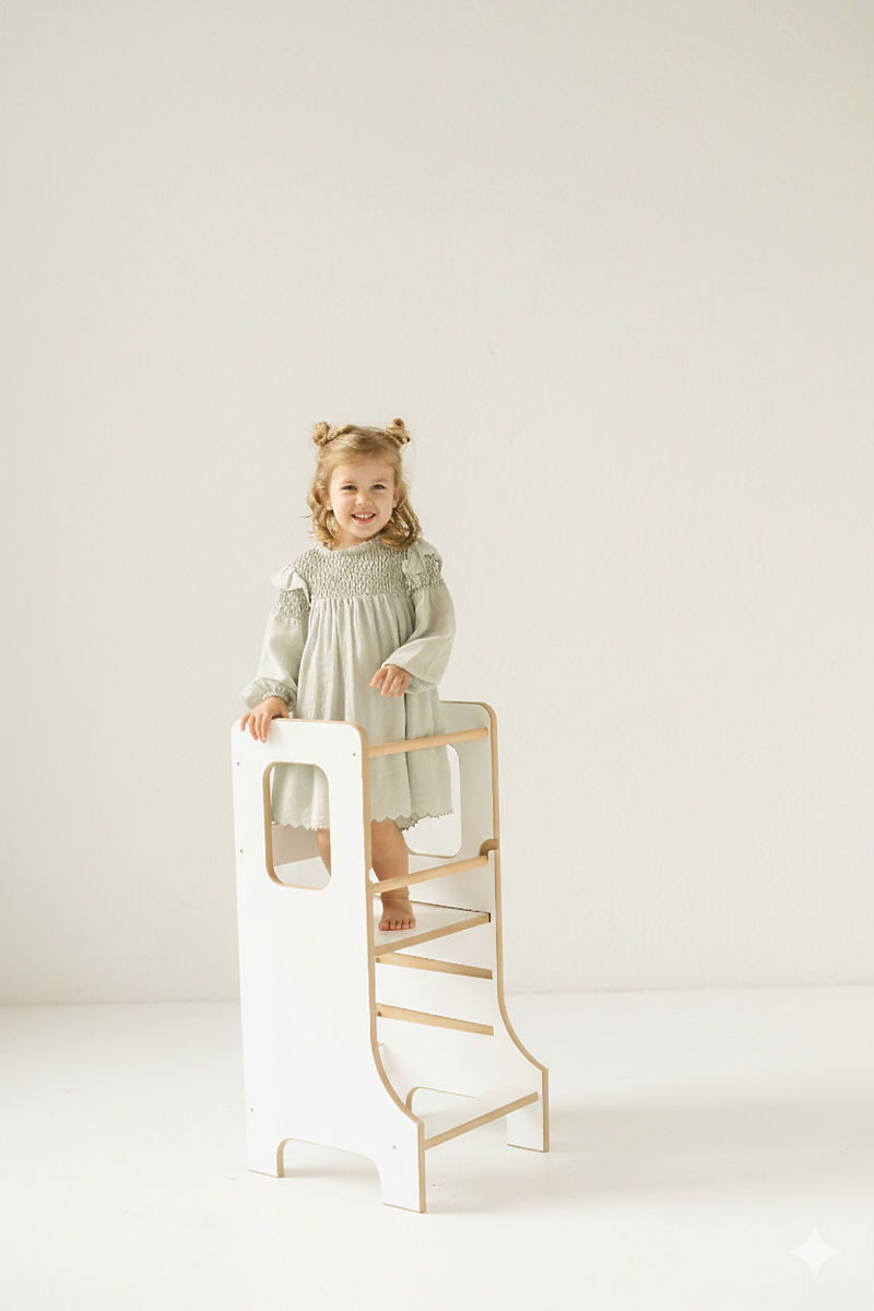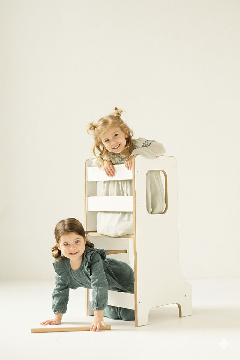 Turnul de învățare SLIM în culoarea albă este alegerea ideală pentru părinții care doresc să implice în siguranță copiii în activitățile casnice obișnuite și să le permită să descopere activ lumea înconjurătoare. Datorită construcției sale ingenioase, sprijină autonomia, creativitatea și dezvoltarea abilităților motorii și ajută copiii să dobândească experiențe noi în mod natural. Momentele petrecute împreună la gătit sau alte activități se transformă astfel în clipe distractive și valoroase. Designul subțire al versiunii SLIM este elegant și nu ocupă mult spațiu, rămânând totuși stabil și sigur. Copiii pot urca și coborî singuri din turn, ceea ce le întărește încrederea și independența.